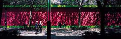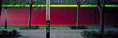 Die Kunsthallenrückwand verändert sich im Laufe des Tages durch die wechselnden Lichtverhältnisse und nachts verändert das grüne Licht des Leuchtkörpers den davorliegenden Platz. In der Dämmerung schaut die Wand als ruhige magenta Fläche auf den verlassenen Platz, die Bank ist leer, der grüne Quader leuchtet. Ueber Mittag wird die Wand zu einer Art riesigen Cinemascope Leinwand für die Schattenspiele der Bäume, die ihr Laubwerk wie einen Dschungel auf die Wand projezieren. Gleichzeitig wird die Wand zur Bühne für die Leute die hier ihre Mittagspause machen, Sandwiches essen, Zeitung lesen und sich unterhalten. Vor der leuchtenden Fläche, in dem geometrischen, reduzierten "Bild der Wand wirken die Leute wie inszeniert und die Wand wechselt von Bild über Leinwand zur Bühne für Benutzer, Betrachter und Passanten.
