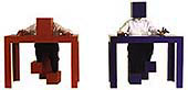 Zwei Schlagzeuge, dargestellt von zwei Personen und dazugehörigem Mobiliar, erzeugen gemeinsam und im Wechsel Rhythmen und Bilder. Die Figuren trampeln und treten, schlagen ihre Köpfe auf die Tische, trommeln mit den Fingerwürfeln, stehen auf und setzen sich. In Verbindung von Skulptur, Figur und Bewegung entsteht eine rhythmische Musik und gleichzeitig ein abstraktes, bewegtes Bild.