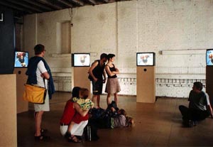 Wir stehen in einem Kreis von Monitoren, inmitten eines Rundtanzes aus Licht, Bewegung und Klang. Alles dreht sich: Bilder, Töne; Frauen sprechen leise, sprechen laut, hüpfen verspielt, springen wild von Bildröhre zu Bildröhre, saugen sich gegen das Zentrum, um dann in der Weite zu verschwinden: ein rasant majestätischer Tanz.