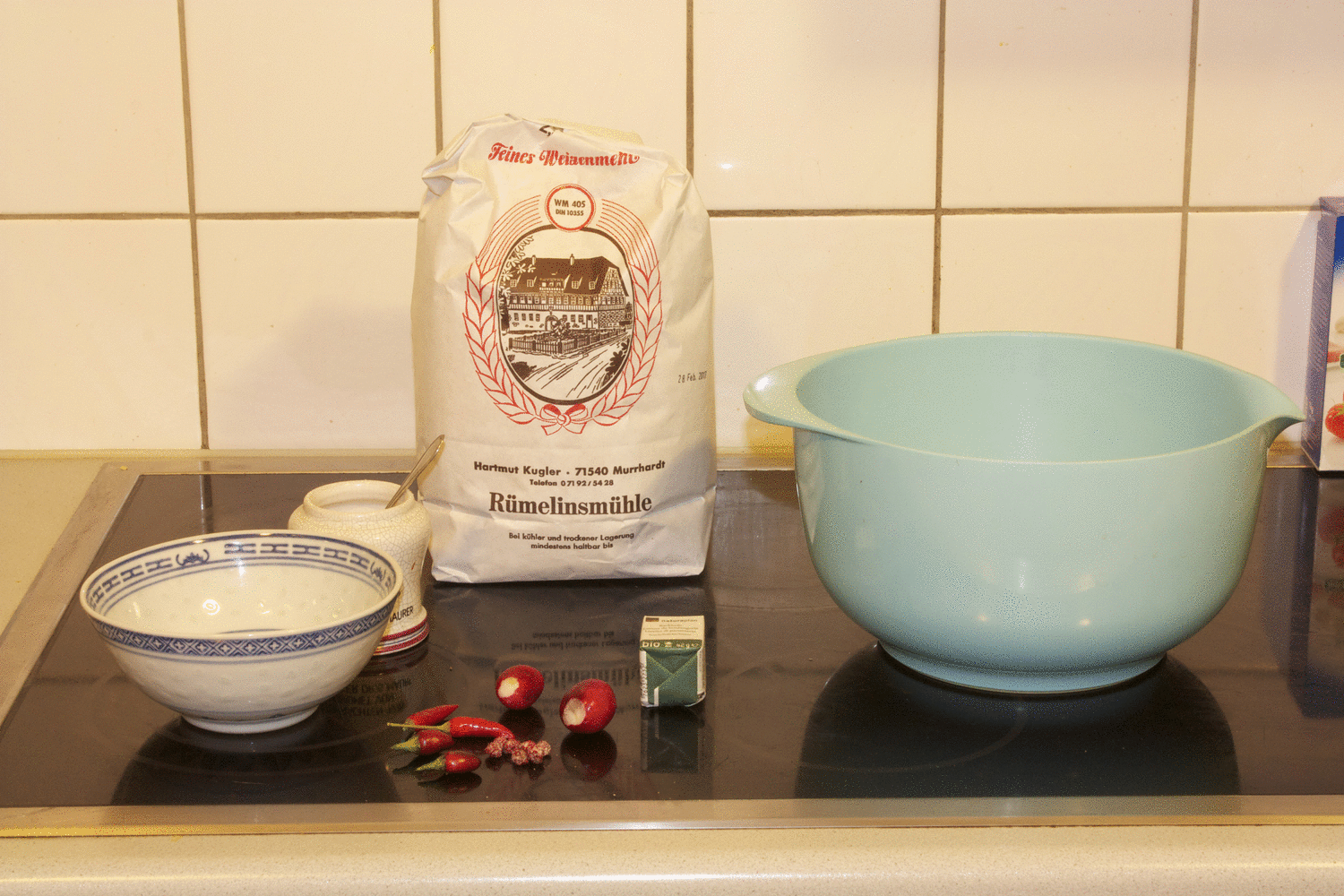 500g Weissmehl, 300ml Wasser, 1/2 Würfel Hefe, 7g Salz