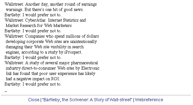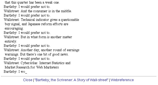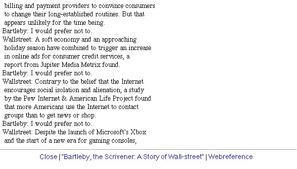 | Thomas Feuerstein: Bartleby. September 2001 Dokumentationsmaterial von Sept. und Nov. 2001 (Screenshots) und vom Jan. 2004 und Dez. 2008 (Movie-Captures), zusammengestellt durch rest/xcult am 18.12.2008. |