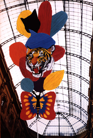 Leben (Tiger), Kunst (Sticken) und Werk (Fotografie) bilden im Tryptichon
