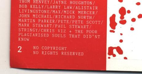 8,,No matter that the Festivals of Plagiarism were mainly art shows for collages & copy art & paintings & other such banal pictorial forms. No matter that Festivals of Recycling might have been more accurate descriptions. The important thing is that by virtue of calling the act of reusing & changing previously existing material (not even always with the intention of critiqueing said material) 'Plagiarism', the appearance of being 'radical' could be given to people whose work was otherwise straight out of art school teachings. If the process of reusing had been called something so uncontroversial as 'recycling' the festivals would have seemed more like the product of 'outmoded hippie liberals' & wouldn't have sold nearly as well.``