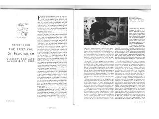 Es ist unerheblich, daß die Festivals of Plagiarism in erster Linie Kunstausstellungen für Collagen, Copy Art, Malerei und ähnliche banale Bildformen waren. Es auch unerheblich, daß 'Festivals of Recycling' der treffendere Titel gewesen wäre. Ins Gewicht fällt, daß, indem das (oft sogar unkritische) Wiederverwenden und Modifizieren von vorgefundenem Material 'Plagiieren' genannt wurde, sich Leute mit gewöhnlichen Kunsthochschul-Arbeiten einen radikalen Anstrich geben konnten. Hätten man diese Wiederverwendung von Material einfach 'Recycling' genannt, dann hätten die Festivals eher wie Produkte alter Hippie-Sozialdemokraten ausgesehen und sich nicht halb so gut verkauft.``8