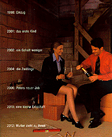 Der zu diesen Strategien passende architektonische Stil und das damit gekoppelte spezifische Genre von Innenstadtgestaltungen breitet sich im Laufe der 90er überall aus. Der kühle Geist von Service und Repräsentation - immer die potentiellen Investoren vor Augen - weht durch all die glas- und travertinverschalten Gewerbeparks, welche nun an zentraler Lage, in und auf Bahnhöfen und neuen Hauptplätzen und nicht mehr auf der grünen Wiese gebaut werden. Dass die dabei bevorzugte Architektur so unangenehm an die faschistoiste Phase der Moderne erinnert fällt langsam aber sicher auf. Privates Handeln, und Begehren ist zwar nicht mehr so sehr durch Traditionen - etwa Kirche und Familie - bestimmt, dafür aber mindestens so nachhaltig durch Werbung, Images und identifikationsstiftende Repräsentation vorgezeichnet. Die Kommunikationsindustrie, als eine Allianz von Medien (News und Unterhaltung), neuen Technologien, visueller Kommunikation, Werbung, Gestaltung und Psychologie produziert den perfekten Mix von begehrenswerten Richtlinien, zwingenden Vorbildern und nachdrücklichen Botschaften; Strategien einer freiwilligen Konditionierung mit realen wirtschaftlichen Konsequenzen. Dabei werden einmal mehr nur wieder die tradtionellen Geschlechterrollen, Familienbilder und Lebensentwürfe stark gemacht.